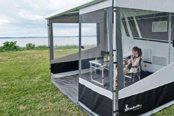 For ekstra læ kan du kombinere Wind Side med en Wind Front, der også nemt monteres i campingvognens/køretøjets markise.
