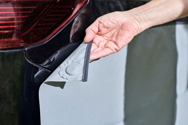 Understykket består av to deler: et langt stykke mellom hjulene og et separat stykke for bakhjulet. Den er laget av slitesterk PVC som beskytter mot vær og vind og sikrer lang holdbarhet. Enkel og skruefri montering med magneter og elastiske stropper for å unngå å lage hull i vanen.