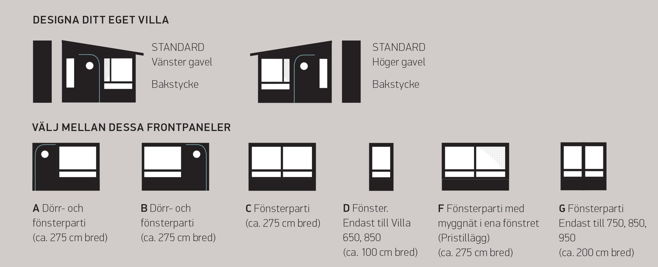 VILLA finns i två djup, fem längder och kan byggas upp med olika moduler. Med de många valmöjligheterna kan du själv utforma dina drömmars VILLA: