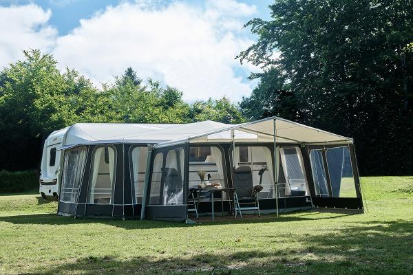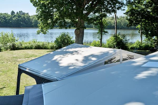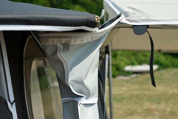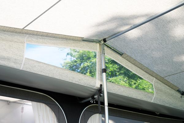 The sun canopy features a unique construction in the form of a top rear panel, which ensures plenty of headroom, even if mounted on the Penta awning under the overhang. To provide plenty of light under the canopy, the rear panel has two windows.